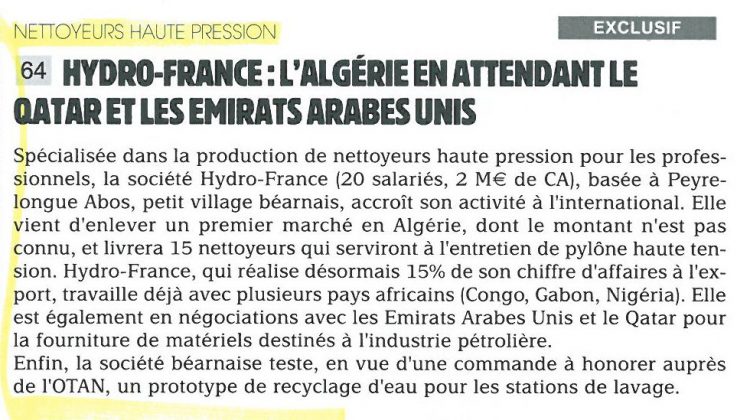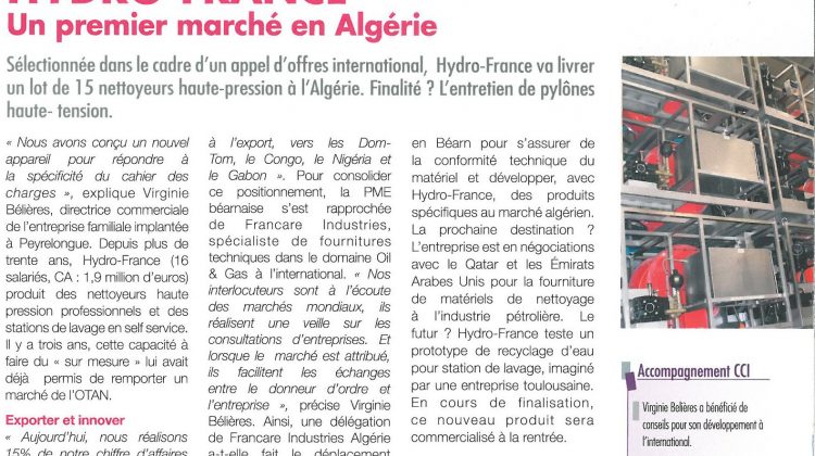 Sélectionnée dans le cadre d’un appel d’offres international, Hydro-France va livrer un lot de 15 nettoyeurs haute-pression à l’Algérie. Finalité ? L’entretien de pylônes haute- tension. « Nous avons conçu un nouvel appareil pour répondre à la spécificité du cahier